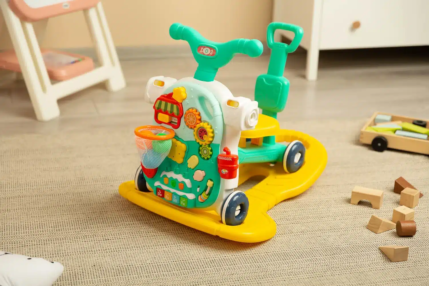 • تصميم 5 في 1: (مشاية – دراجة – سكوتر – طاولة – هزاز).